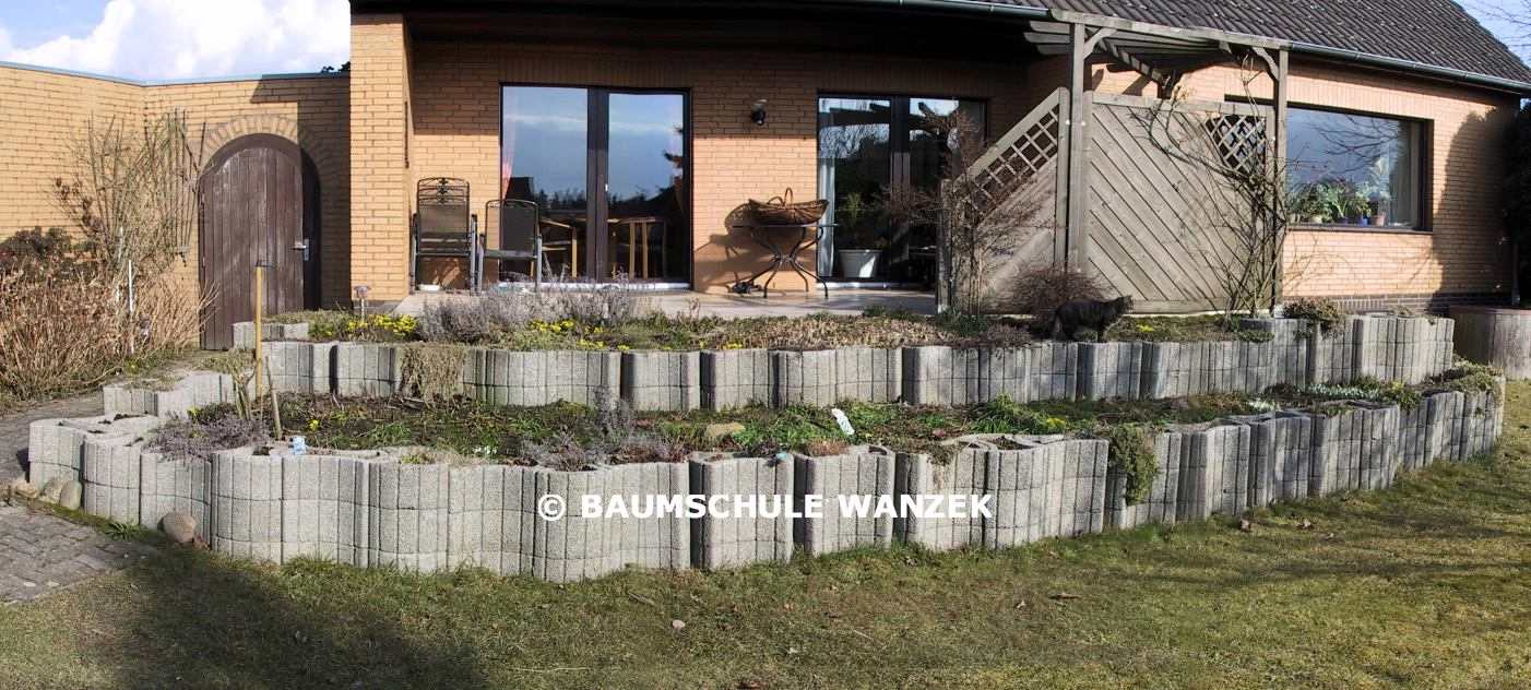 Eine unschöne Abstützung für einen Wintergarten wird durch ein hochgesetztes Beet hinter einer Trockenmauer verdeckt.
