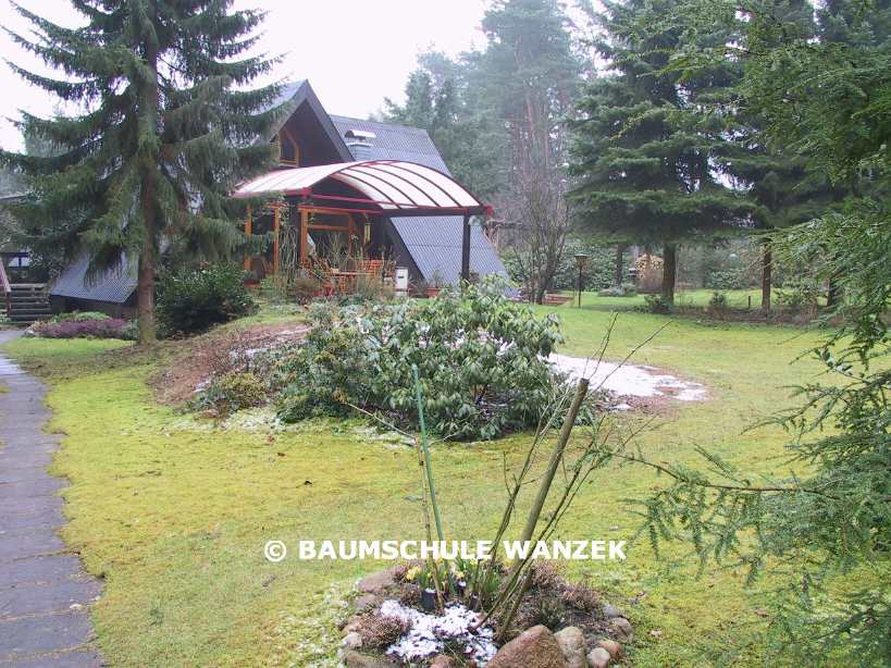 Der Sichtschutz für die Terrasse sollte nach dem Fällen der zu groß gewordenen Fichten vom Standpunkt der Fotos wieder gegeben sein. Versetzt angeordnete Solitärgehölze erfüllen die Vorgabe ohne eine Wand zu bilden.